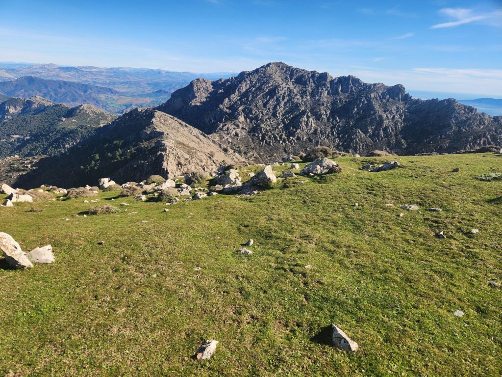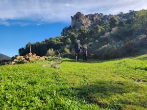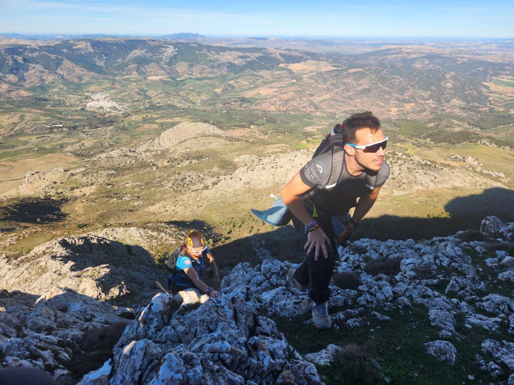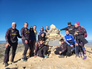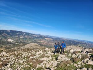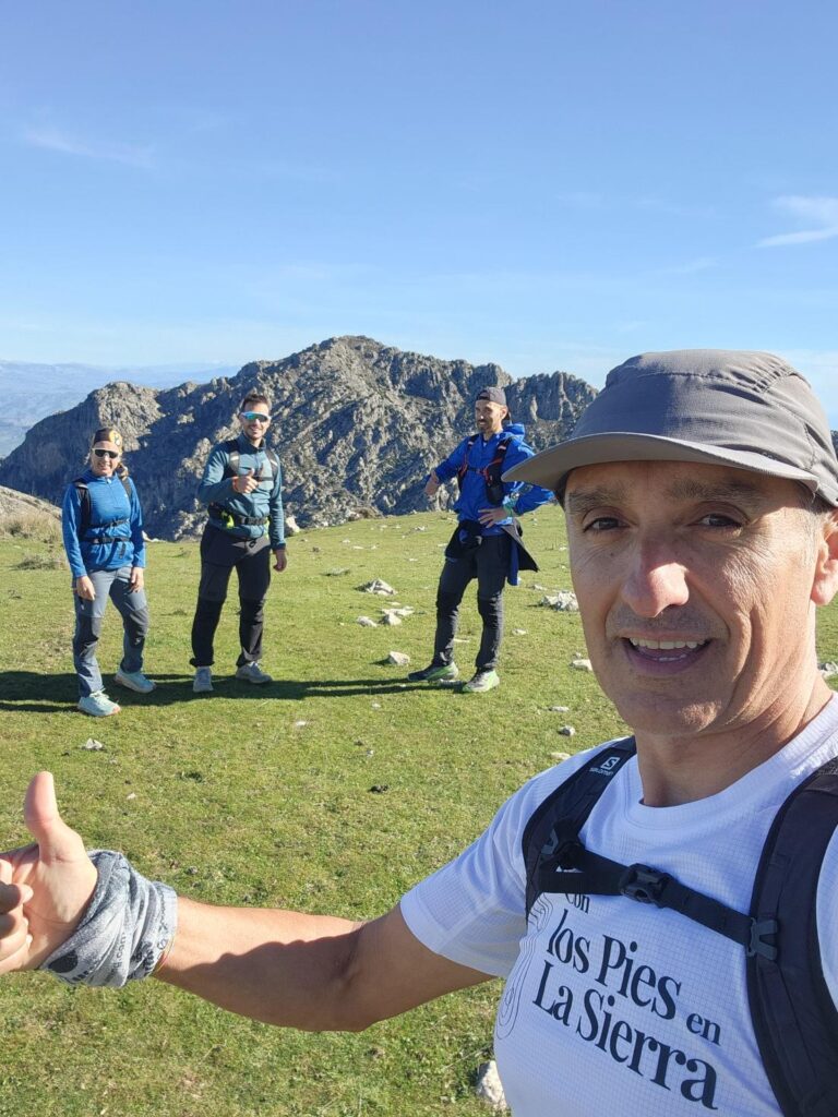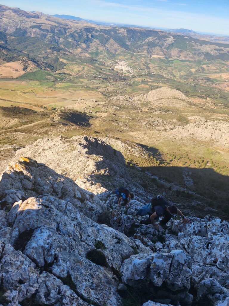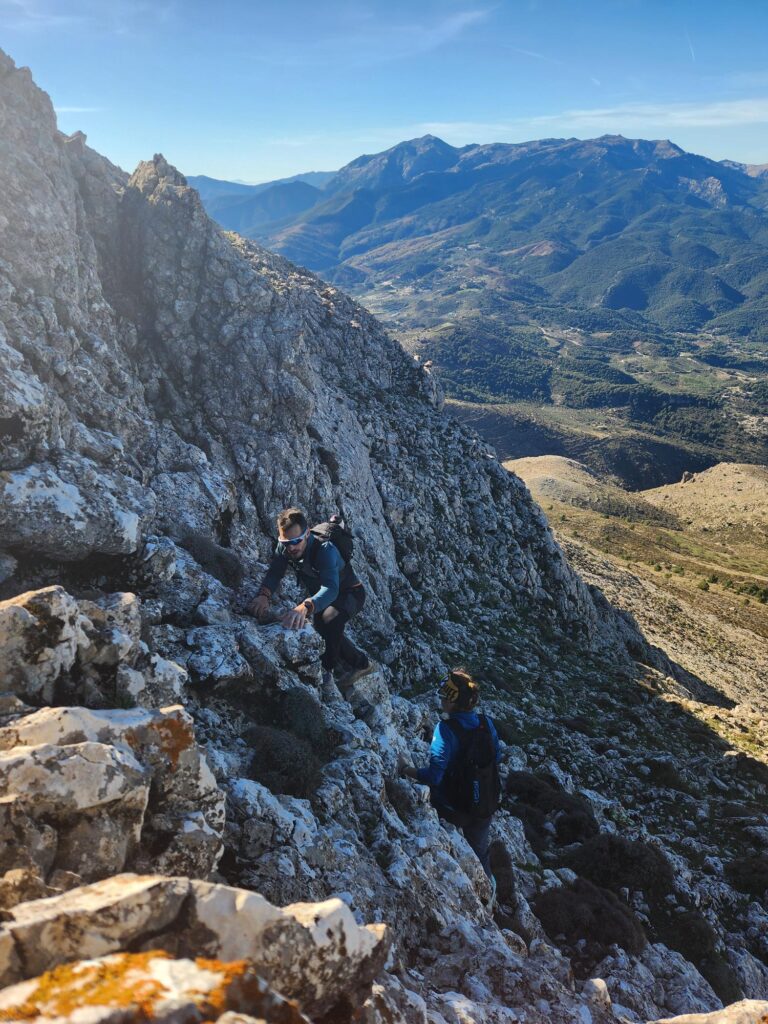 Aprovechando que el grupo era reducido y que el ritmo era «vivo» nos hemos aventurado a acometer la subida a Sierra Cabrilla por la cara Sur/Oeste rodeando toda la cara de tajos para ascender por el único lugar accesible. Cañada potente y algunas trepadas bastante cañeras. Hemos disfrutado de lo lindo.